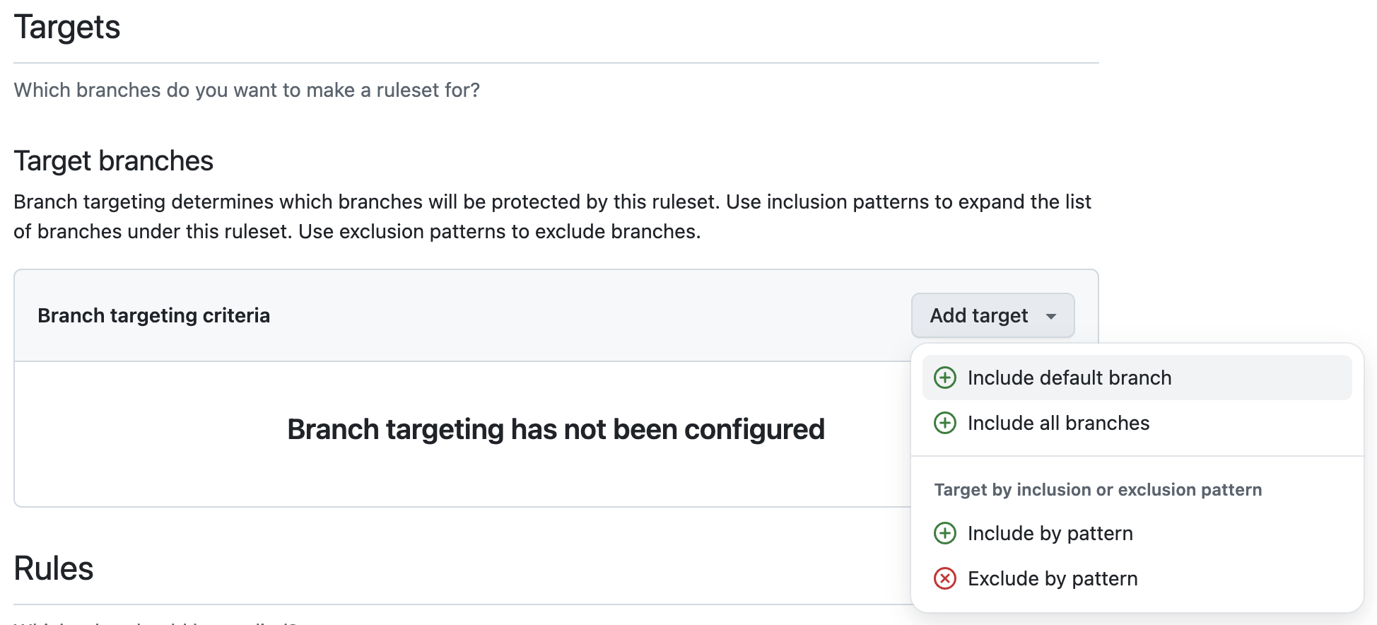 Scroll down to the Targets section and click on Create target. Select the branch you want to protect. We recommend choosing Include default branch, but depending on your workflow you may want to choose one or multiple branches.