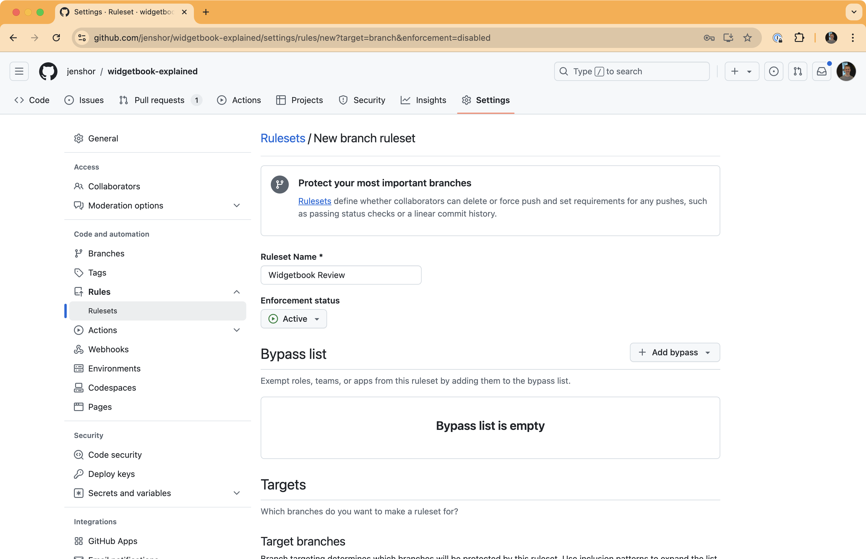 Set a name for the new ruleset. For instance, set it to Widgetbook Review.