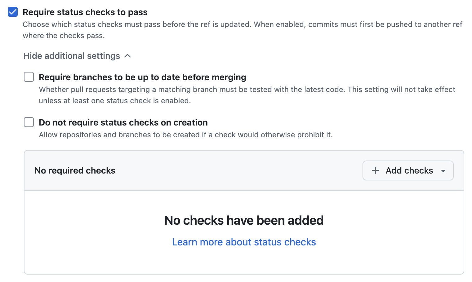 Scroll down to the rules section. Disable the pre-selected rules. Once everything is deselected, enable the rule Require status checks to pass.