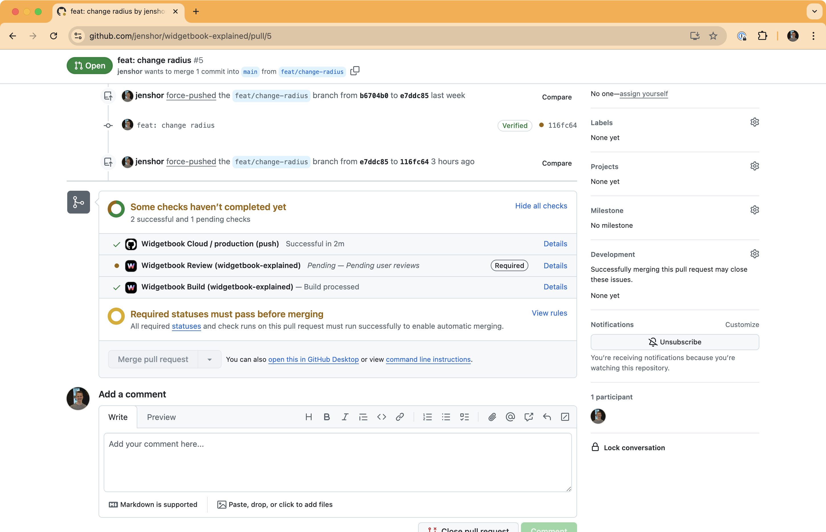 Navigate to a PR to verify that the Widgetbook Review status check is now required to merge the PR.