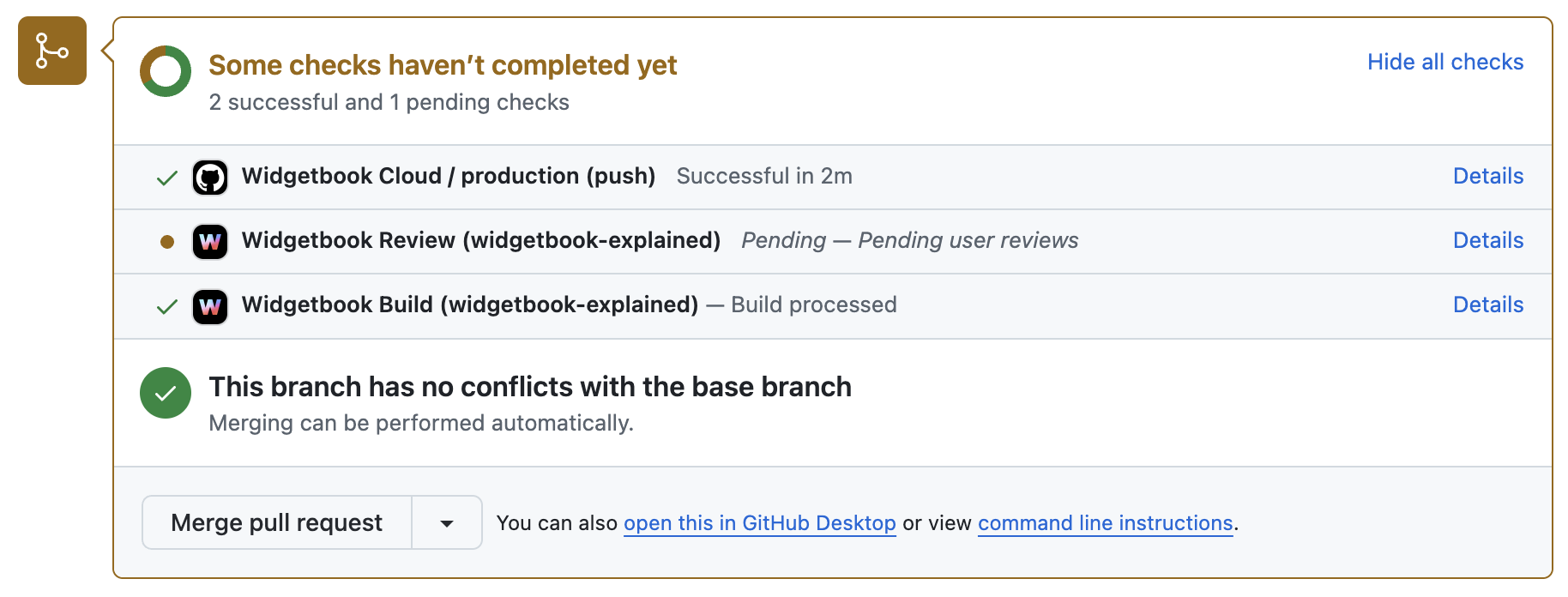 In the example above, the status check is named Widgetbook Review (widgetbook-explained).