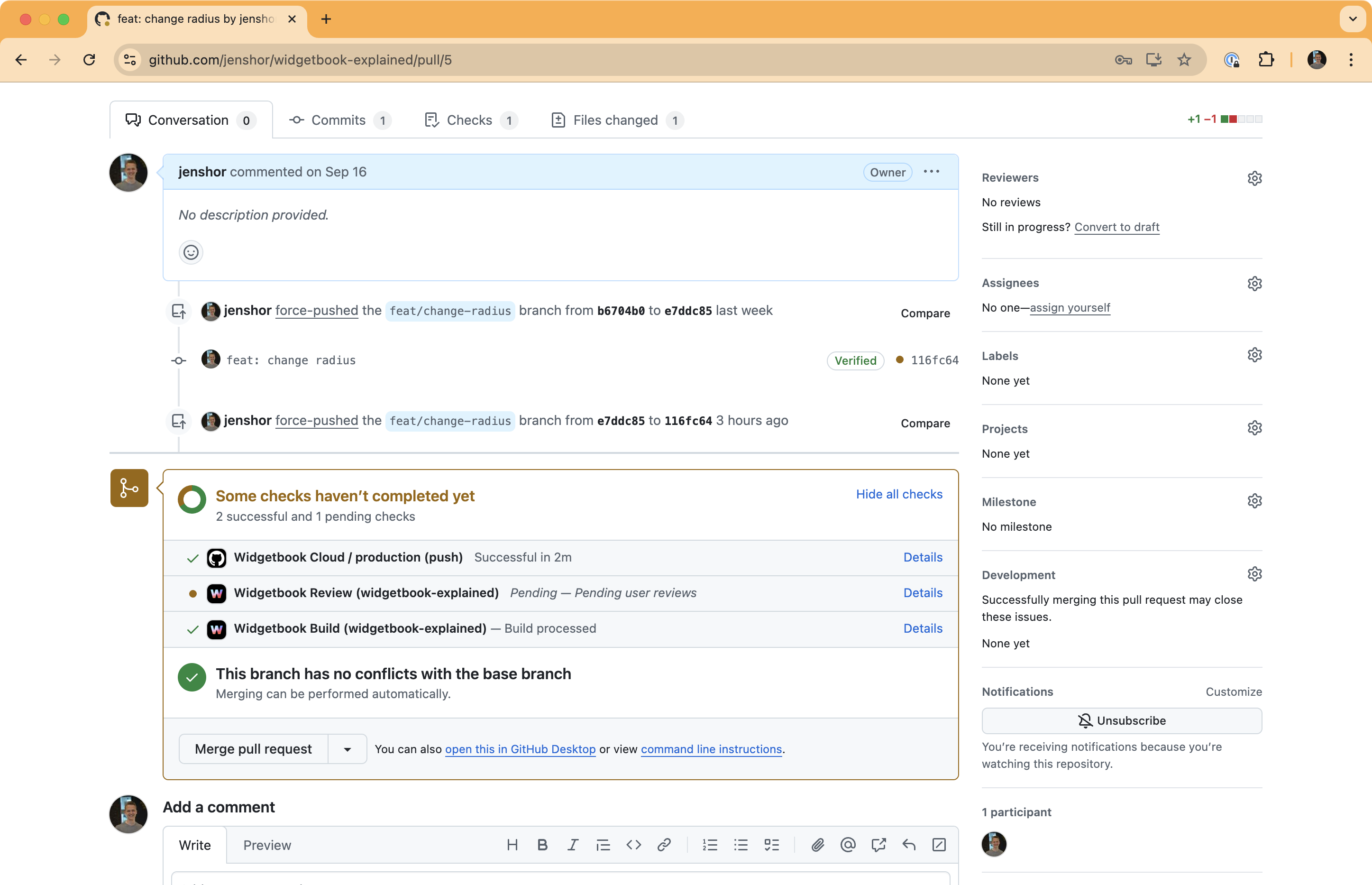 Example of a pending review not blocking the merge of the PR.