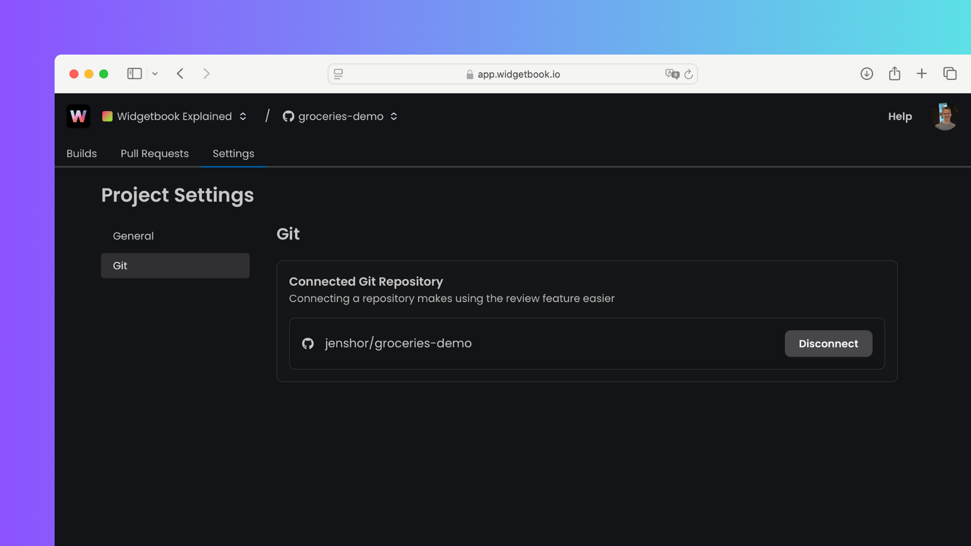 Connected projects automatically synchronize builds with their commit status and link reviews with their associated pull requests, enhancing Widgetbook Cloud's integration into your workflow.