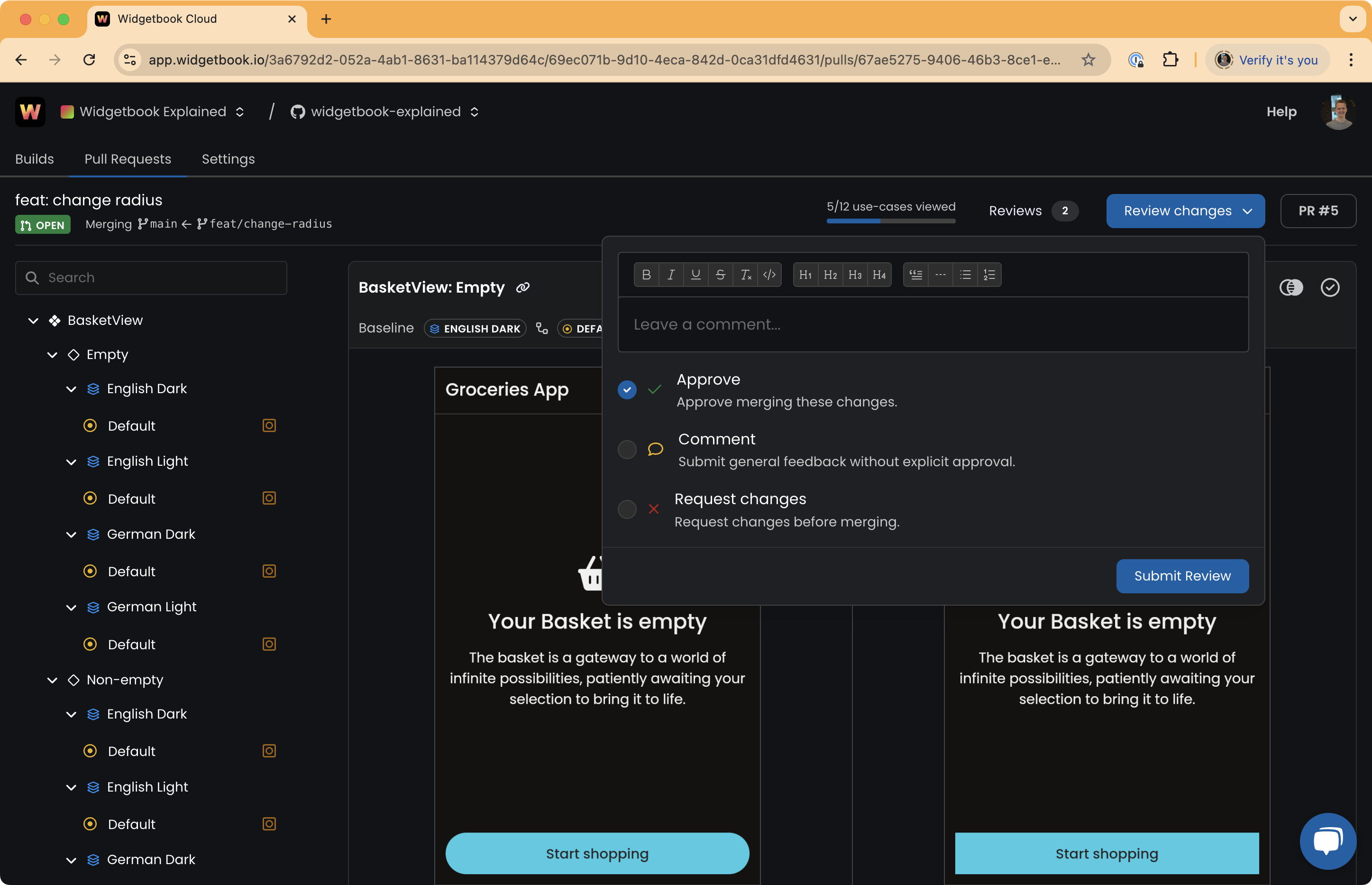 - Comment: The changes are neither approved nor rejected, but you want to leave feedback for the author. If integrated with a Git provider, Widgetbook Cloud sets the commit status to pending, unless overridden by another status.