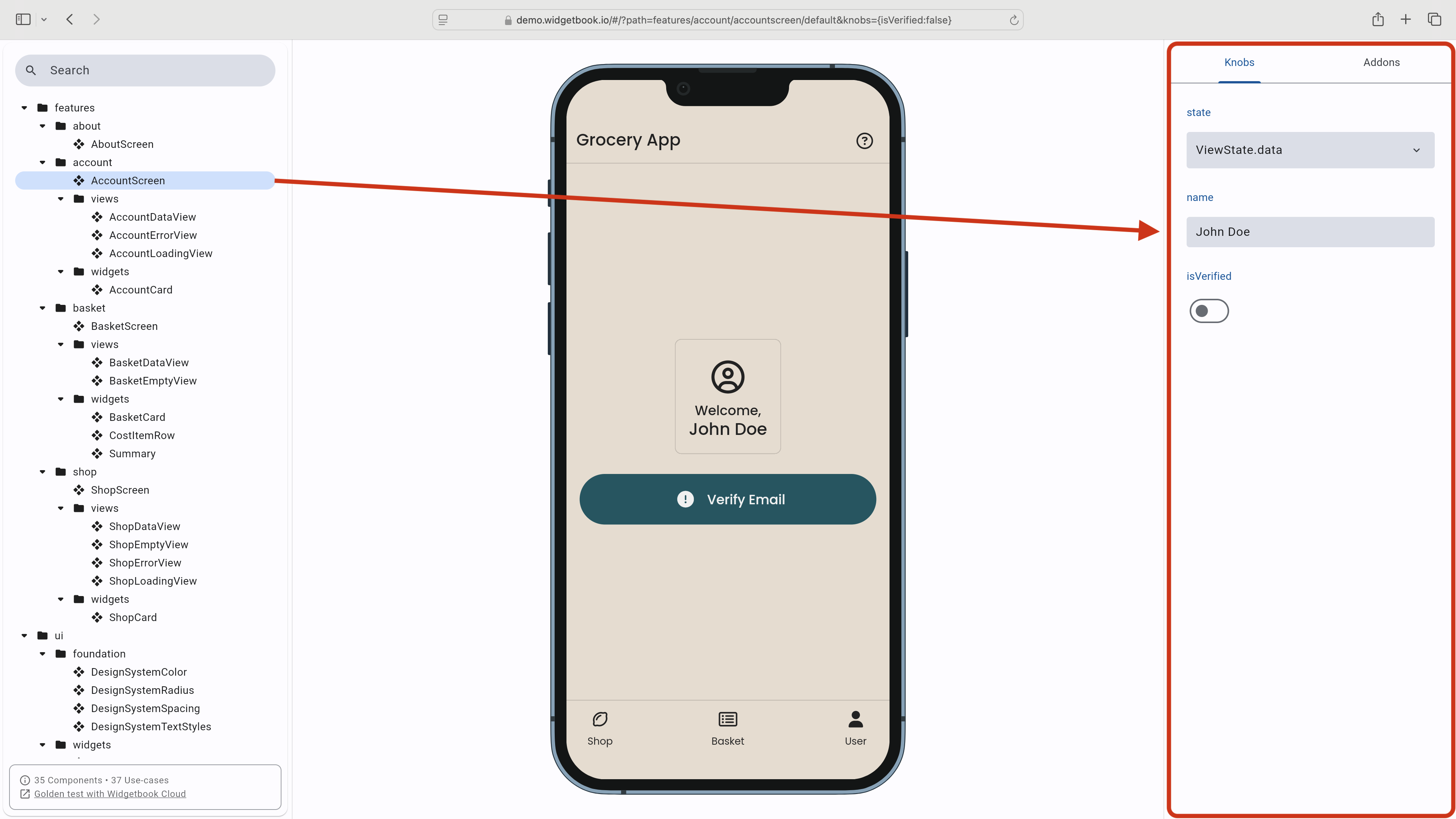 Knobs are dynamic tools in Widgetbook that allow you to modify the parameters passed to a use-case on the fly. They allow you to adapt and examine your widgets under various conditions and inputs, enhancing the overall understanding of a component's behavior.