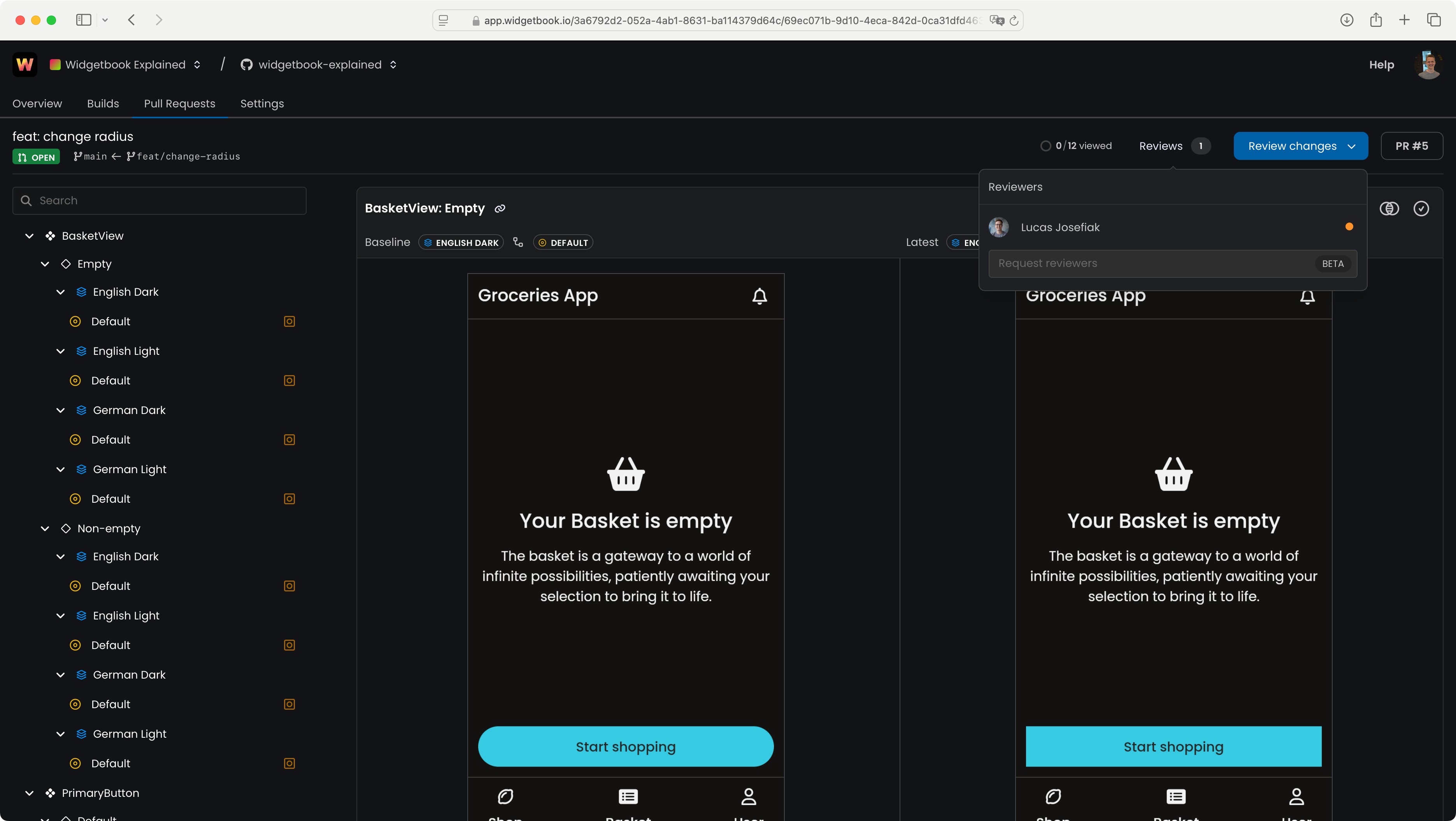 Open the visual pull request on Widgetbook Cloud and open the reviews context menu.