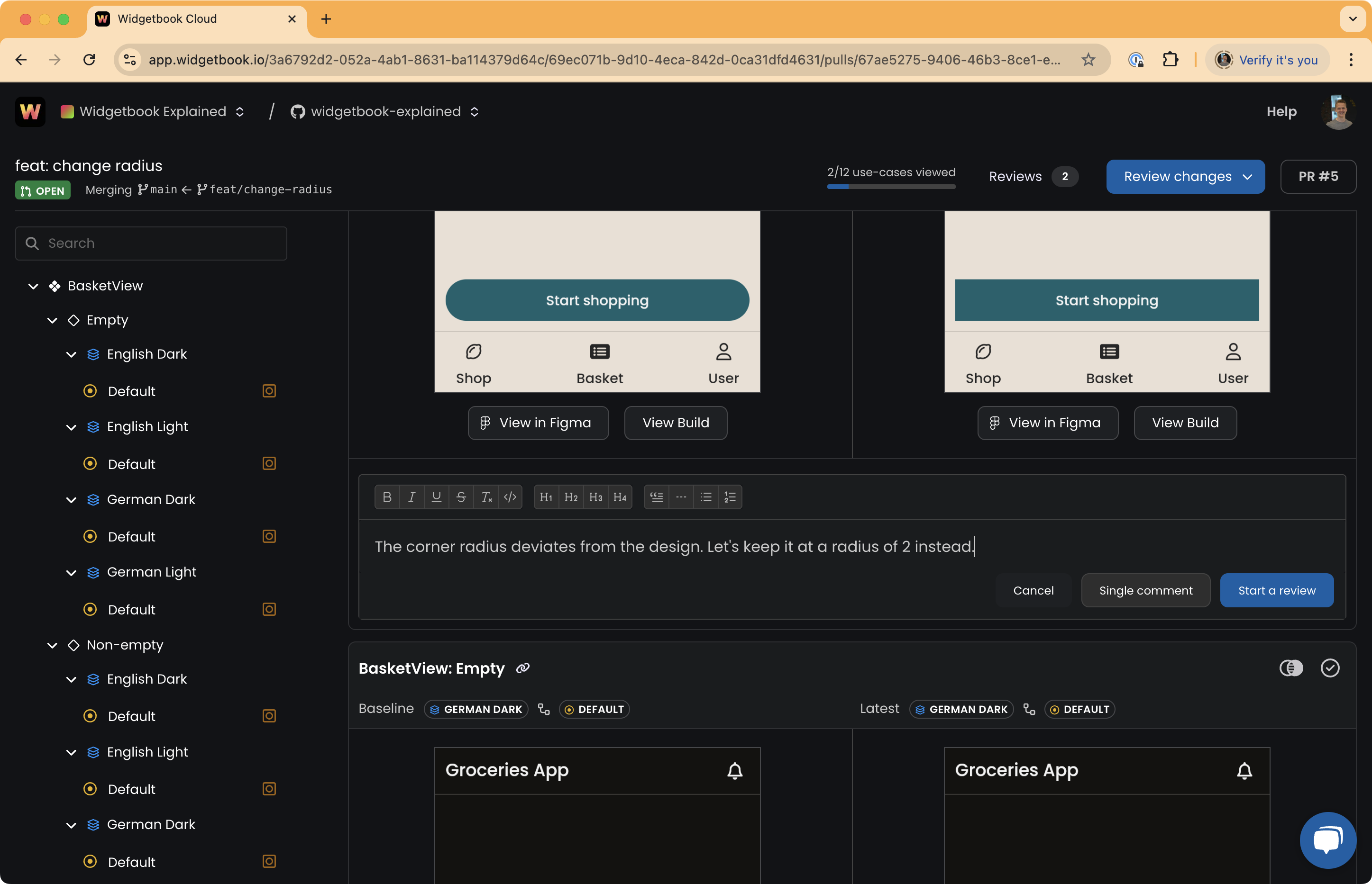 - Comment: The changes are neither approved nor rejected, but you want to leave feedback for the author. If integrated with a Git provider, Widgetbook Cloud sets the commit status to pending, unless overridden by another status.