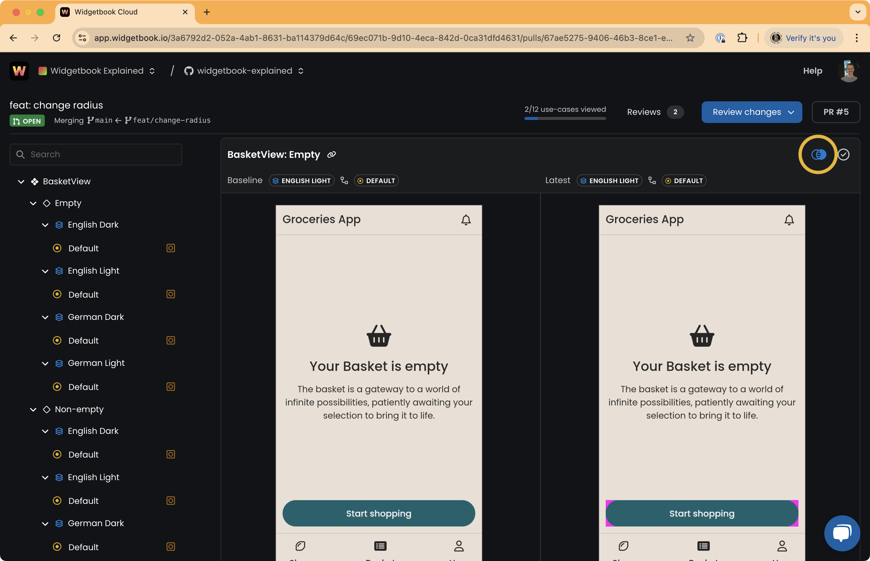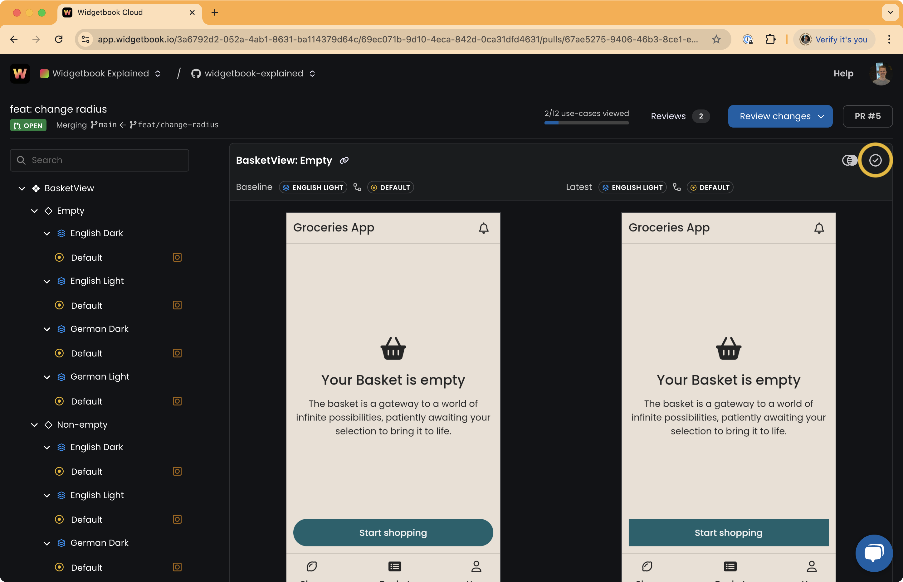 Click the "mark as viewed" button in the top-right of a use case diff to mark changes as reviewed. If you are iterating on a pull request, the diff will remain marked as viewed as long as no new changes are introduced. When changes occur, the viewed state resets and you must review the changes again.